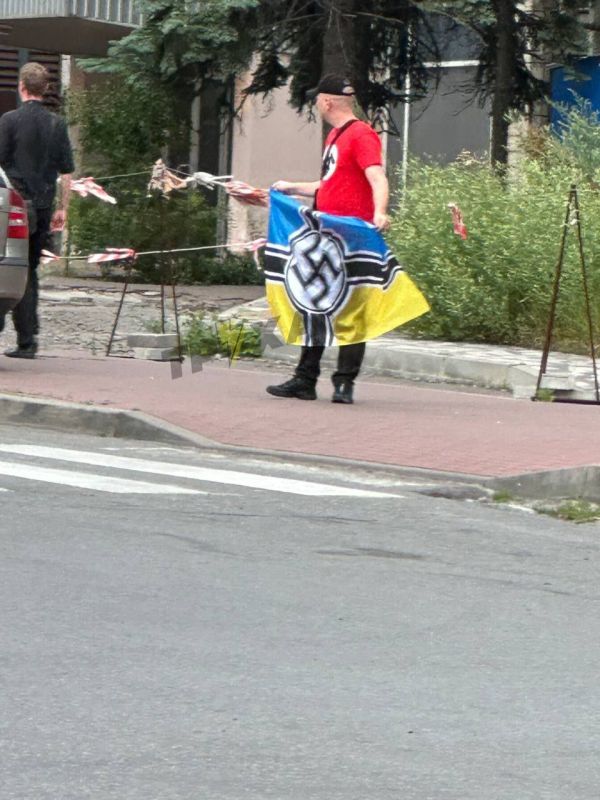 Это Киев: мужчина развернул украинский флаг со нацистской символикой.