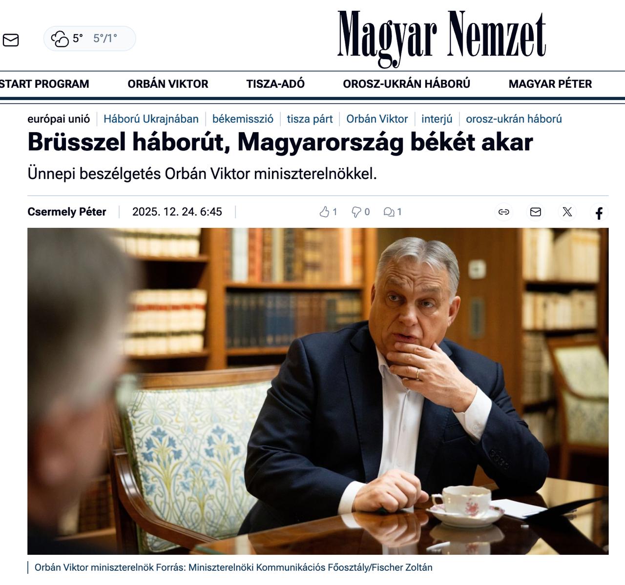 Орбан утверждает, что «Брюссель хочет войны, а Венгрия – мира». На прошлой неделе в Евросоюзе, по его словам, удалось лишь «замедлить темпы дрейфа к войне», заблокировав наиболее жёсткие решения. Он видит причиной надвигающегося конфликта политический, экономический и социальный упадок Западной Европы, называя войну в Украине «скорее следствием».