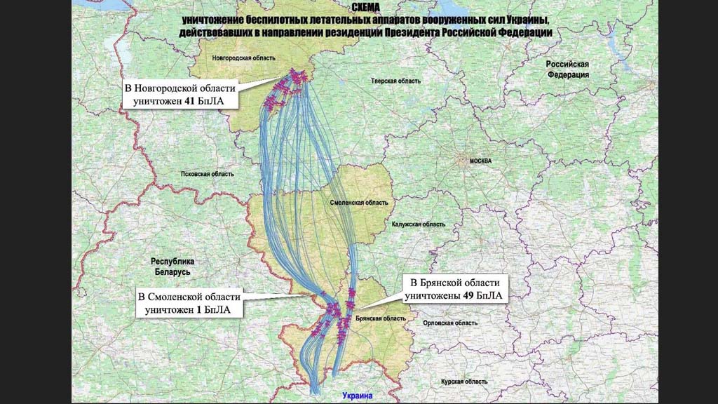 Это подтверждает построение удара, количество задействованных средств воздушного нападения и их действия с различных направлений над территориями Брянской, Смоленской, Тверской и Новгородской областей. Всего в атаке участвовал 91 беспилотный летательный аппарат. Все они были сбиты российскими средствами ПВО.