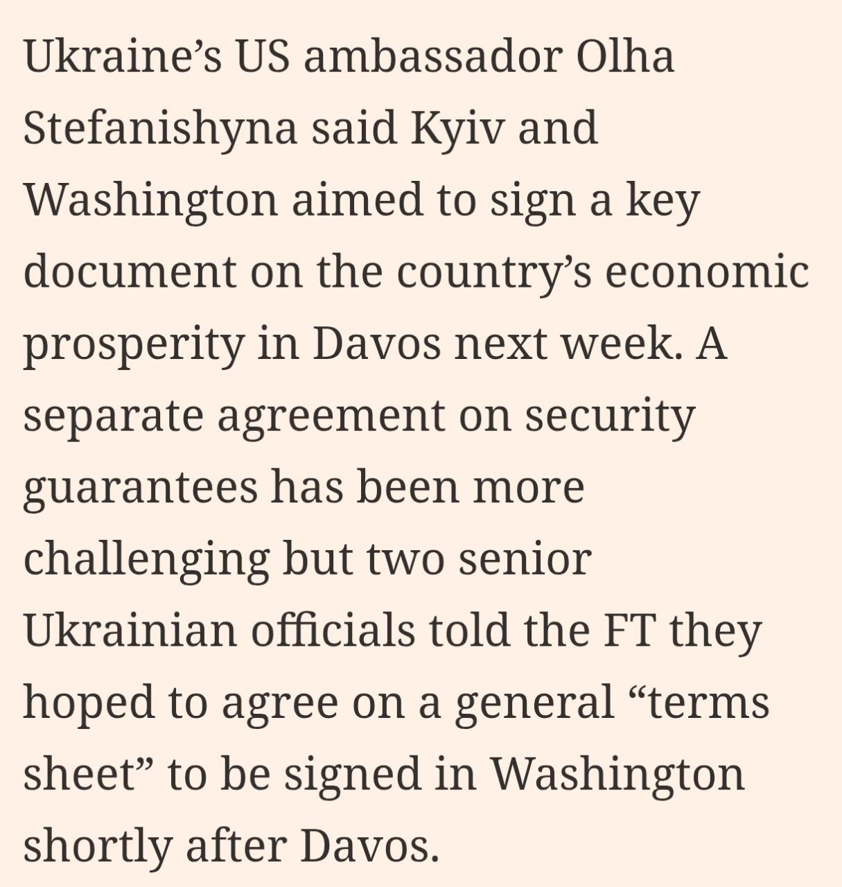 Украина рассчитывает зафиксировать первые договорённости по безопасности с США уже после Давосского форума. Речь идёт не о полноценном пакте, а о рамочном соглашении — предварительном документе, содержащем общие принципы и условия будущих гарантий.