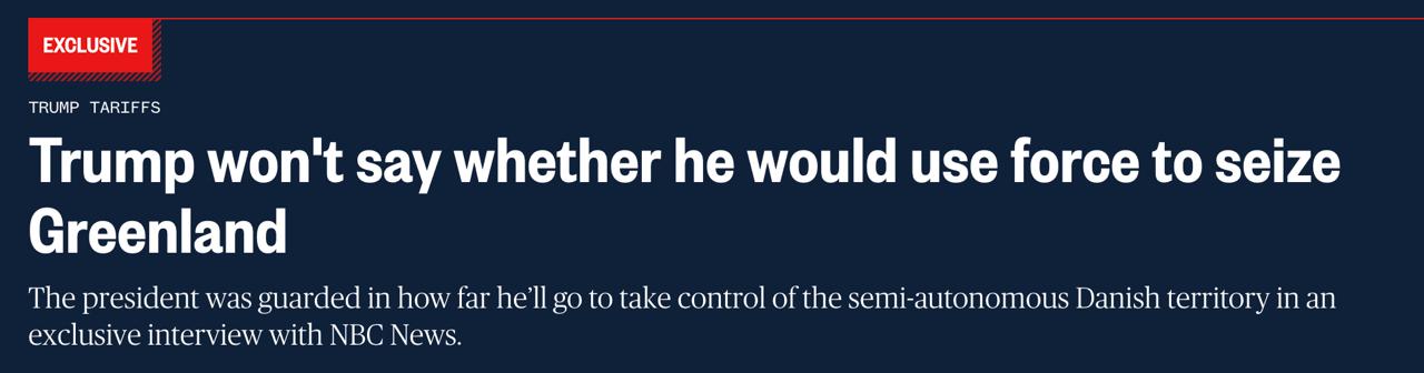 Президент США отказался отвечать на вопрос NBC News о готовности использовать армию для захвата Гренландии, ограничившись фразой «без комментариев». При этом он заявил, что на 100% намерен ввести пошлины против европейских стран, если они не согласятся на сделку о передаче острова США.