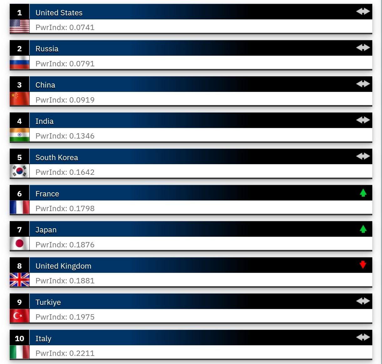 С первой тройкой все понятно. У США серьезный отрыв по ключевым показателям, начиная с беспрецедентного военного бюджета. Хотя в битве ядерных держав это преимущество быстро нивелируется. Особенно, когда у тебя есть средства поражения со «специальной боевой частью», против которых еще не изобрели систем противодействия. У Украины вон спросите.