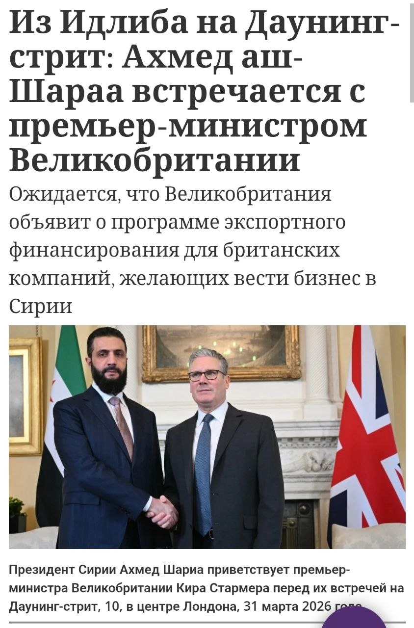 А еще обратите внимание на хронологию. До встречи с Зеленским, 31 марта, Ахмед аш-Шараа вылетел из Берлина прямиком в Лондон.