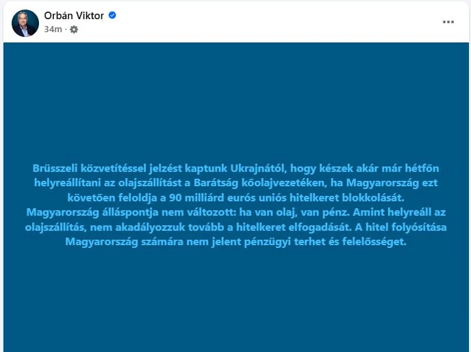 Украина готова с понедельника восстановить поставки по "Дружбе", если Венгрия снимет вето на кредит в €90 млрд от ЕС, — Орбан