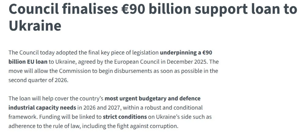 ЕС одобрил 20-й пакет санкций против РФ и полностью завершил процедуры согласования кредита в 90 млрд евро для Украины.
