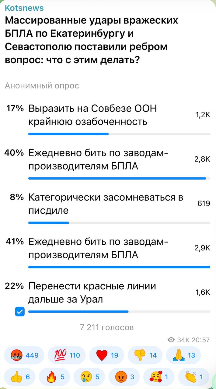 41 процент подписчиков предпочли бы ежедневные удары по заводам, производящим БПЛА. Если бы еще все они были на Украине.