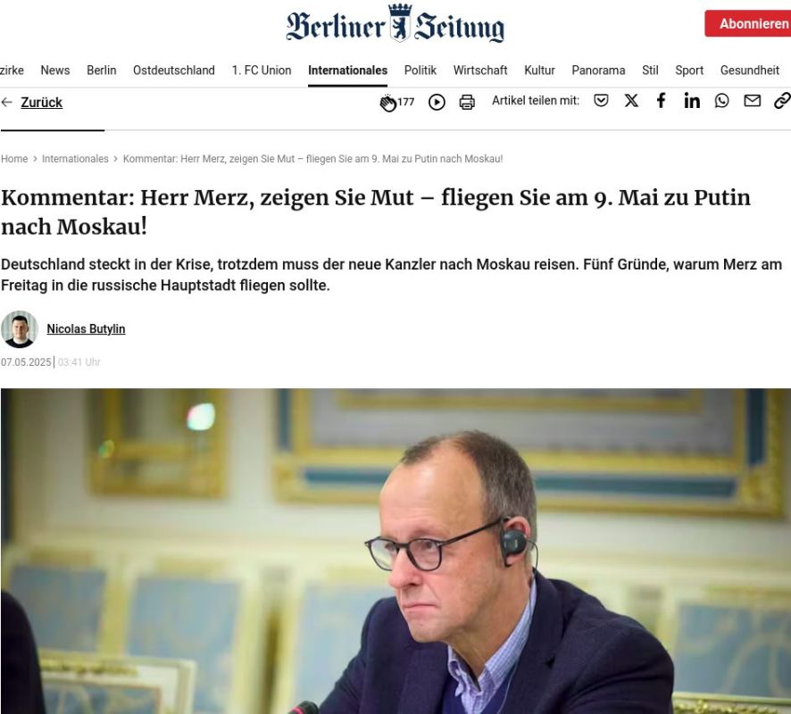 За последние три года Германия терпит политический провал на международной арене. Визит Мерца в Москву мог бы стать эффективным дипломатическим шагом. Он должен держать открытой дверь, которую Запад давно хочет закрыть,