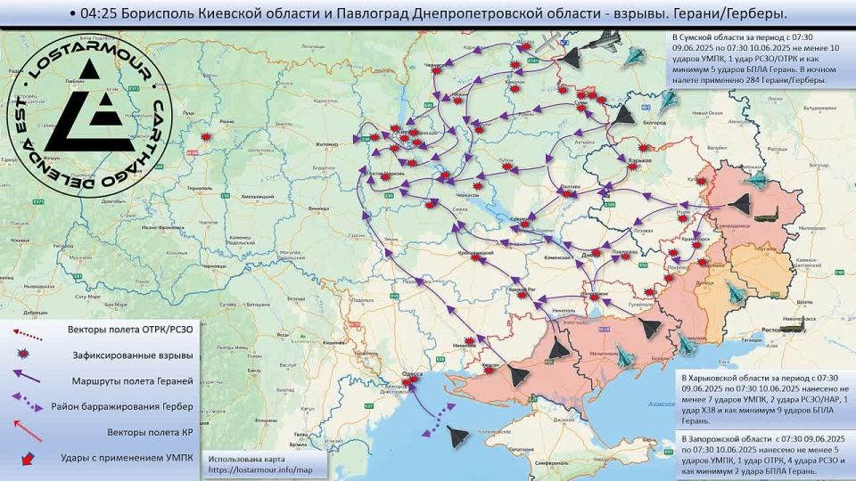 Анимированная схема ударов по территории Украины 9-10 июня 2025 года