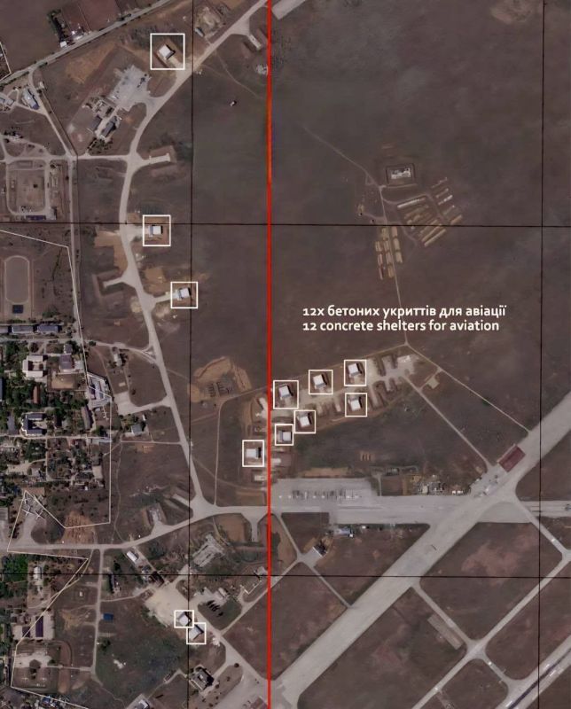 Спутниковые снимки аэродрома Саки в Крыму, на которых враг запечатлел строительство железобетонных укрытий для авиации, а также пять разведывательно-ударных БПЛА "Орион".