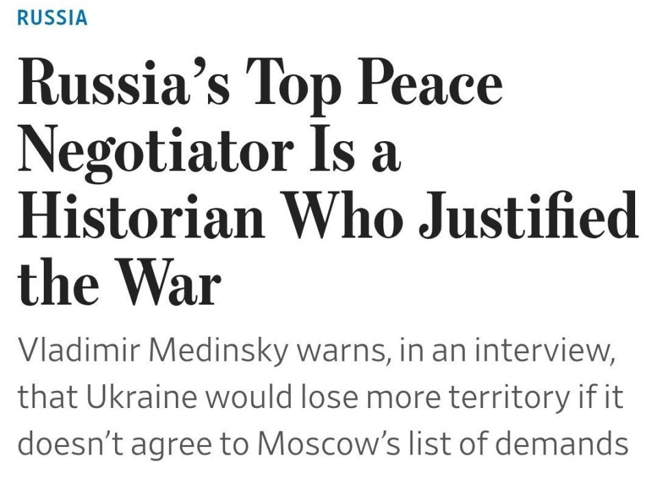 Неготовность Украины к компромиссам в переговорах с Россией только приведет к дальнейшим территориальным потерям для Киева. Москва будет вынуждена отвечать, пишет The Wall Street Journal со ссылкой на Владимира Мединского. Главное из статьи: