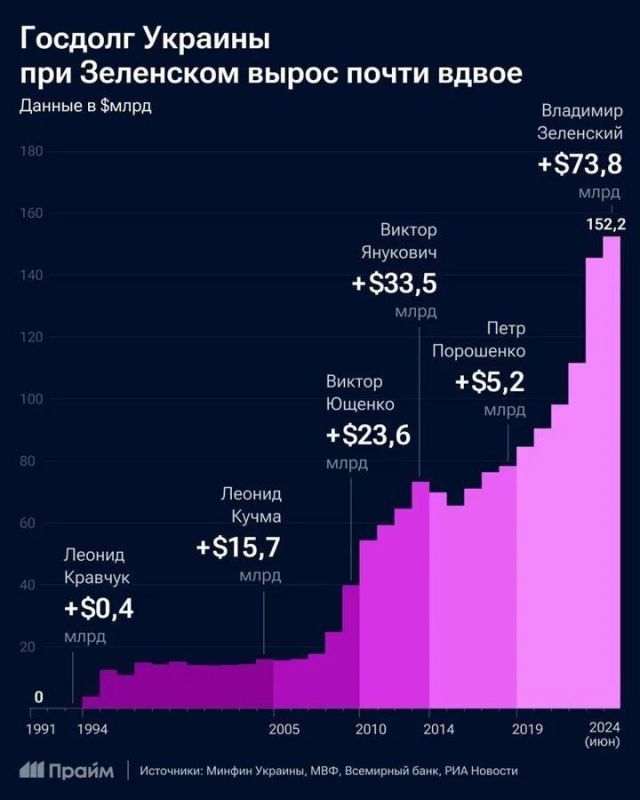 По данным Министерства финансов Украины, на конец июня совокупный объём государственного и гарантированного государством долга Украины составил $184,84 млрд.