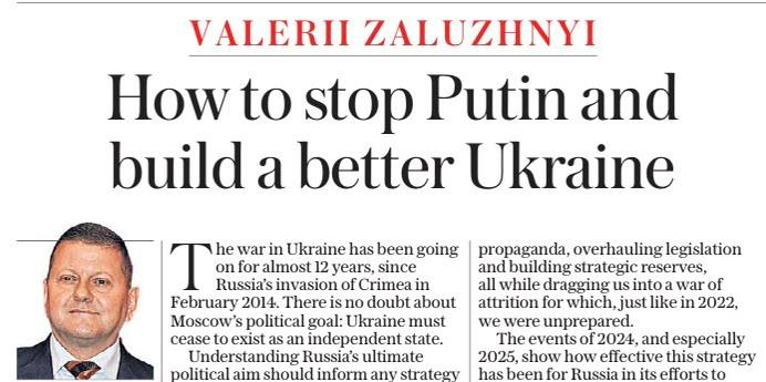 Само собой, в условиях политического кризиса на Украине не мог не всплыть Валерий Залужный. Точнее - его не могли не вытолкнуть быстренько на передний план британцы. Сегодня The Sunday Telegraph печатает статью этого украинского Цицерона с выносом на первую полосу. И заголовок соответствующий, программный: «Как остановить Путина и построить лучшую Украину».