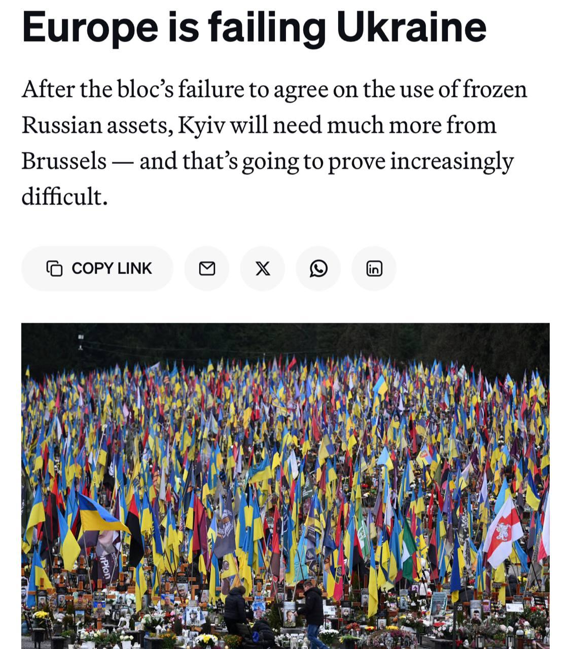 Европа подводит Украину, говорится в статье. После того как ЕС не удалось договориться об использовании замороженных активов РФ, Киеву потребуется от Брюсселя значительно больше поддержки. А это будет всё труднее, подчёркивается в материале.