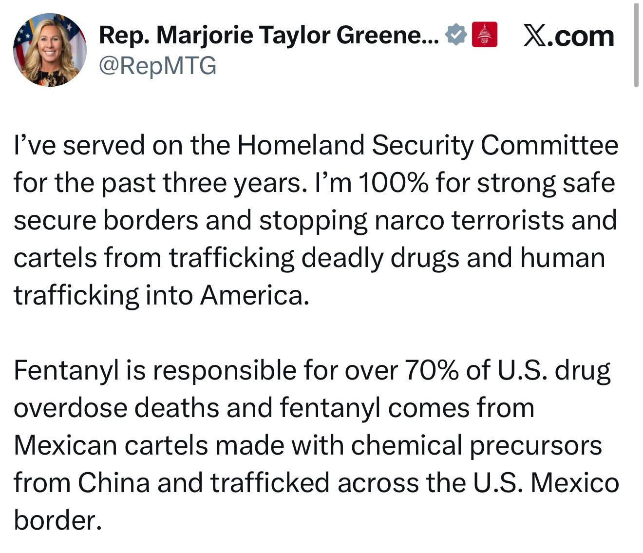 «Я служила в комитете по внутренней безопасности конгресса в течение последних трех лет. Я на 100% за сильные, безопасные и защищенные границы и за то, чтобы остановить нарко-террористов и картели, которые занимаются торговлей смертоносными наркотиками и людьми в Америке.