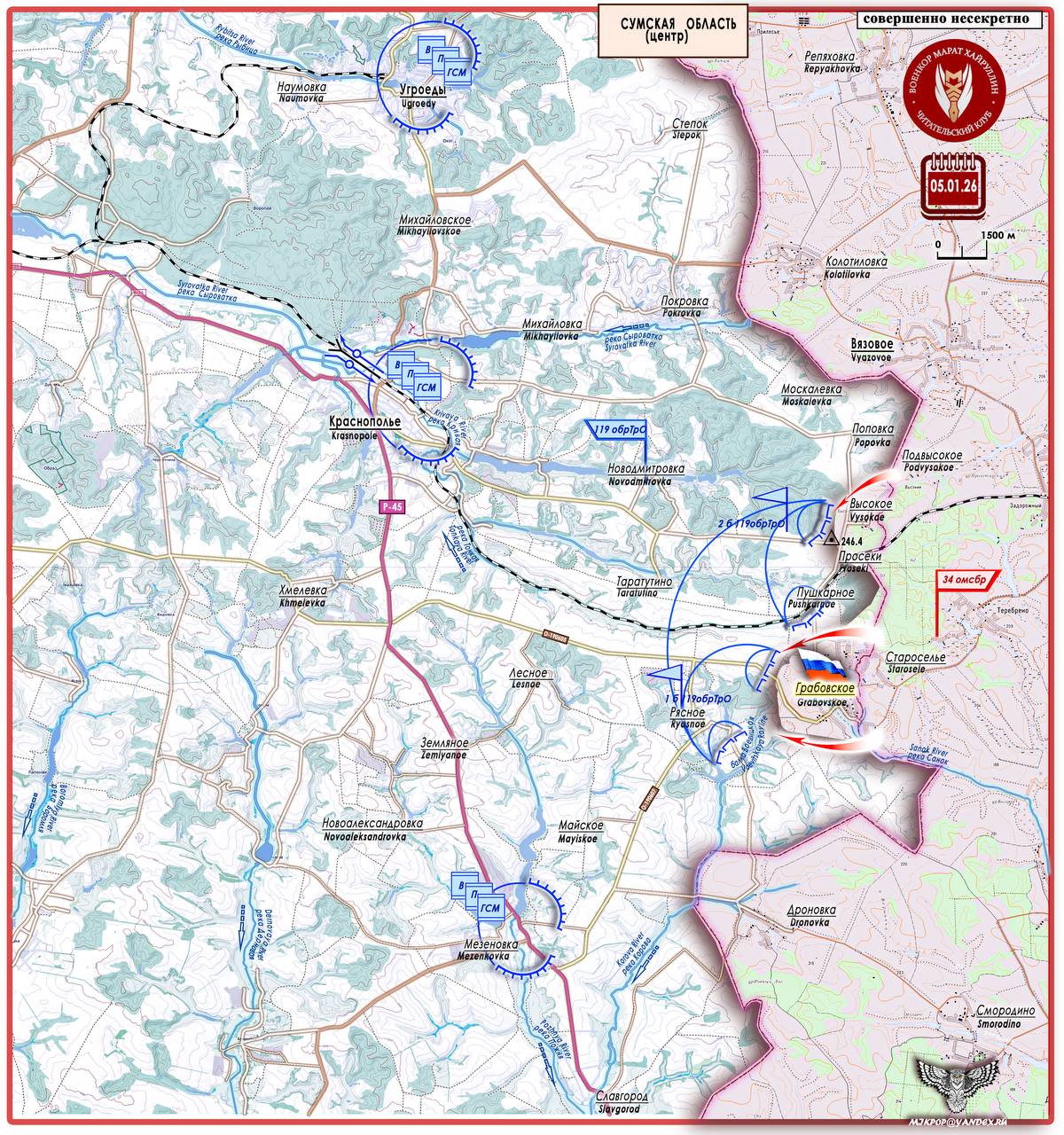 5 января 2026 г. подразделения 34 отдельной мотострелковой бригады группировки «Север» начали движение по дороге О-190605 и освободили н.п. Грабовское (50°4150 с. ш. 35°2725 в. д. - население в 2001 году 720 чел.) на территории Сумской области южнее н.п. Высокое (освобожден 20.12.25 г.).