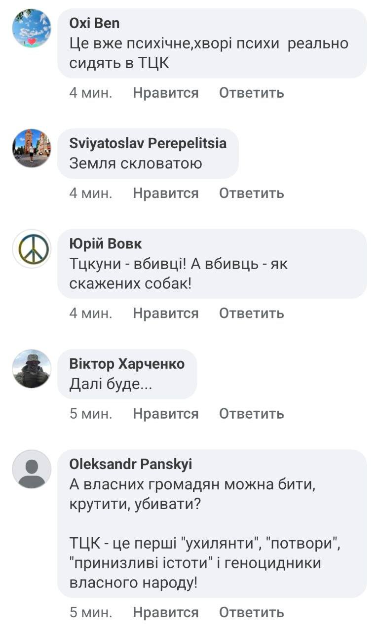 В комментариях сотрудникам ТЦК желают «землю стекловатой», ТЦКшников называют «убийцами и предлагают поступать с ними как с бешеными собаками». Кроме того, говорят, что все «ТЦКшники и полицейские должны быть немного неживыми».