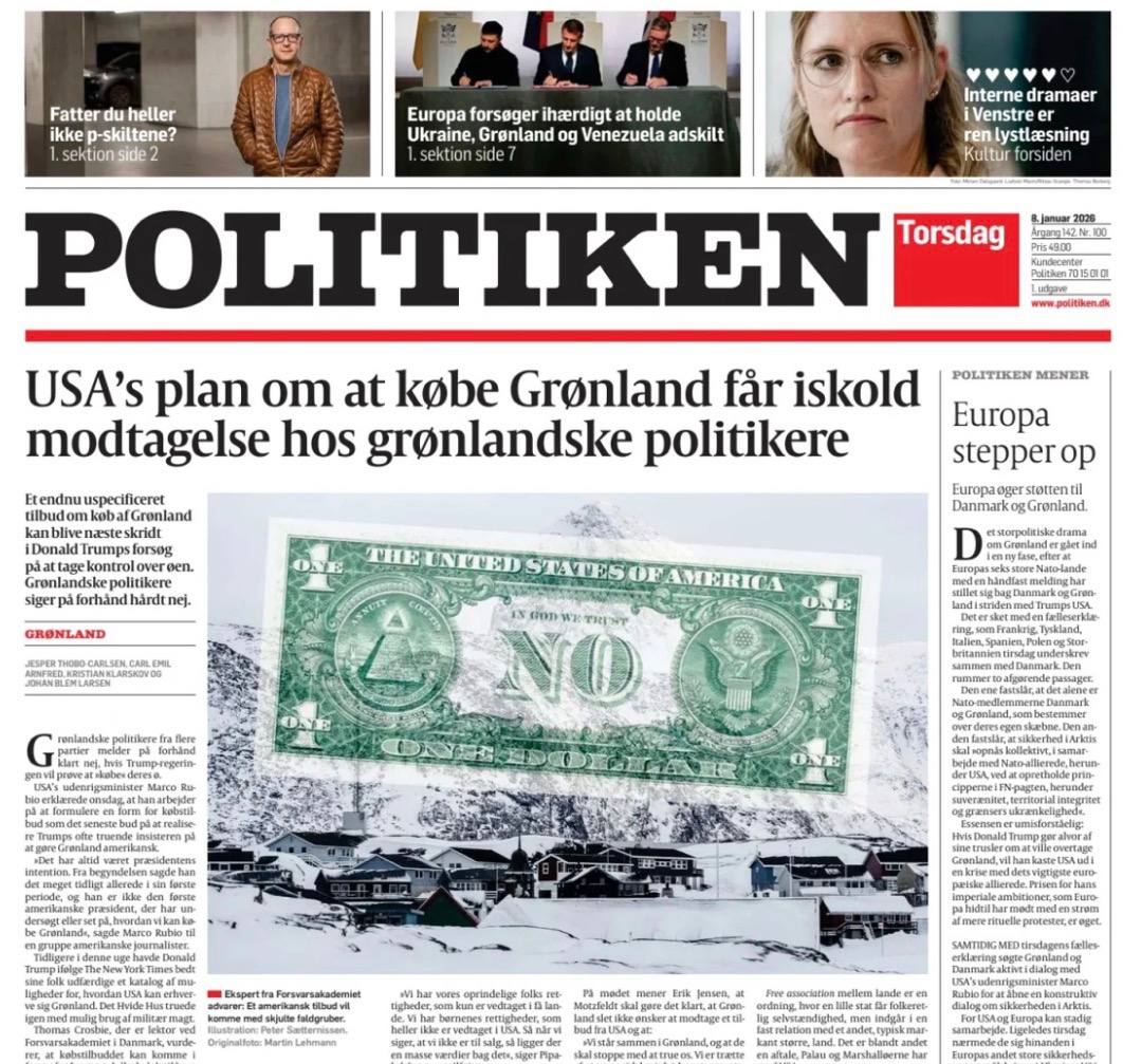 Продолжаю с искренним интересом следить за датской прессой, которая в последнее время одержима темой Гренландии (и куда только Украина делась?). Но судя по сегодняшней первой полосе Politiken, стадию отрицания и гнева тамошние газеты уже прошли, перейдя к стадии торгов.