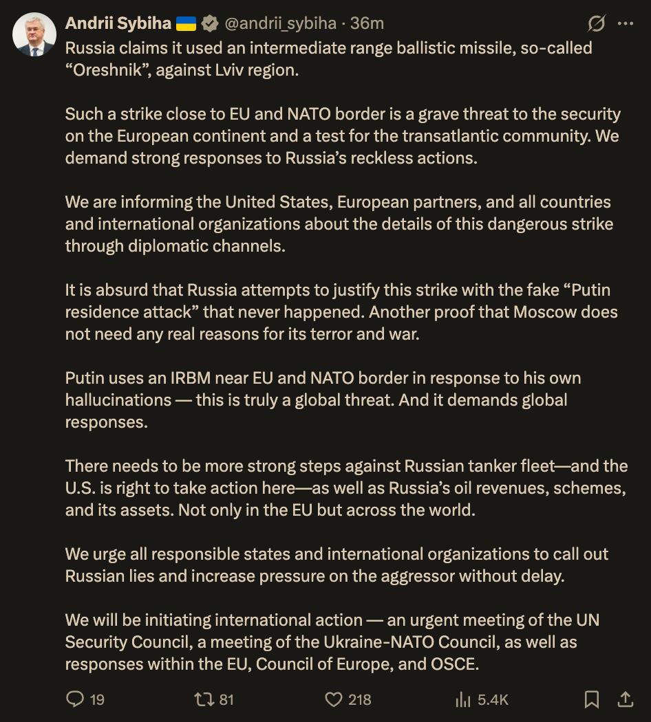 Украина инициирует срочное заседание ООН после удара РФ по Львову "Орешником" — глава МИД Украины Андрей Сибига