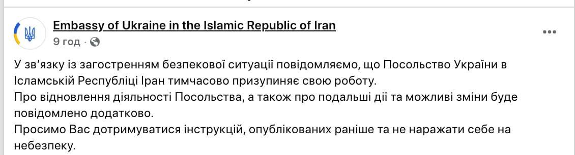Посольство Украины в Иране приостановило работу. Такое решение было принято в связи с обострением ситуации безопасности в Иране. На какой срок, пока неизвестно.