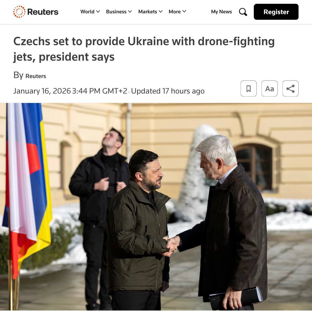 "Чешская Республика может в относительно короткие сроки поставить несколько средних боевых самолетов, которые очень эффективны в борьбе с беспилотниками, и я верю, что нам удастся быстро и успешно решить этот вопрос", — сказал он.