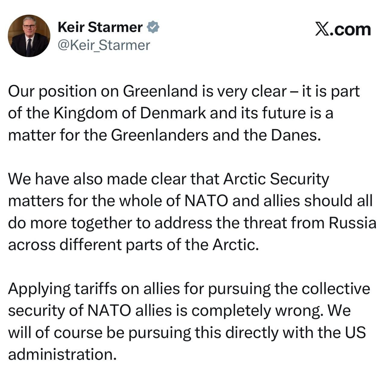 Также Трампа осудил Кир Стармер. Он высказался сильно мягче Макрона, но суть была та же — противодействие России в Арктике — это важно, а о противоречиях стоит забыть. Повышать тарифы — неправильно.
