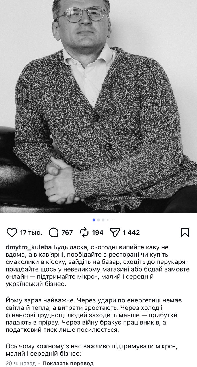 Обедать в ресторанах и пить "каву" не дома, чтобы поддержать малый бизнес, предложил украинцам экс-глава МИД Кулеба.