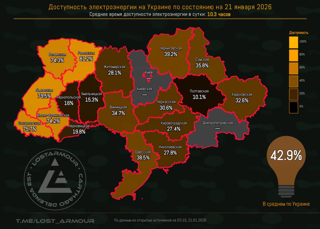 Инфографика доступности электроэнергии на территории Украины по областям на 21 января 2026.