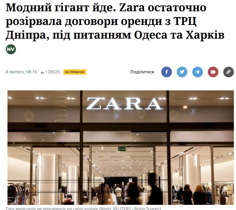 ZARA уходит из Днепропетровска: под вопросом пока остаются Харьков и Одесса, а из Киева Zara ушла еще в декабре 2022 года. Все из-за нестабильной работа ТРЦ и меньшего количества покупателей, из-за чего бизнес становится убыточным.