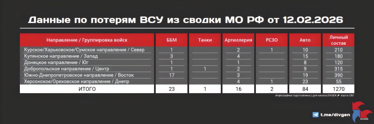 Как сообщает ТГ-канал "DIVGEN", потери противника за сегодняшний день составили: