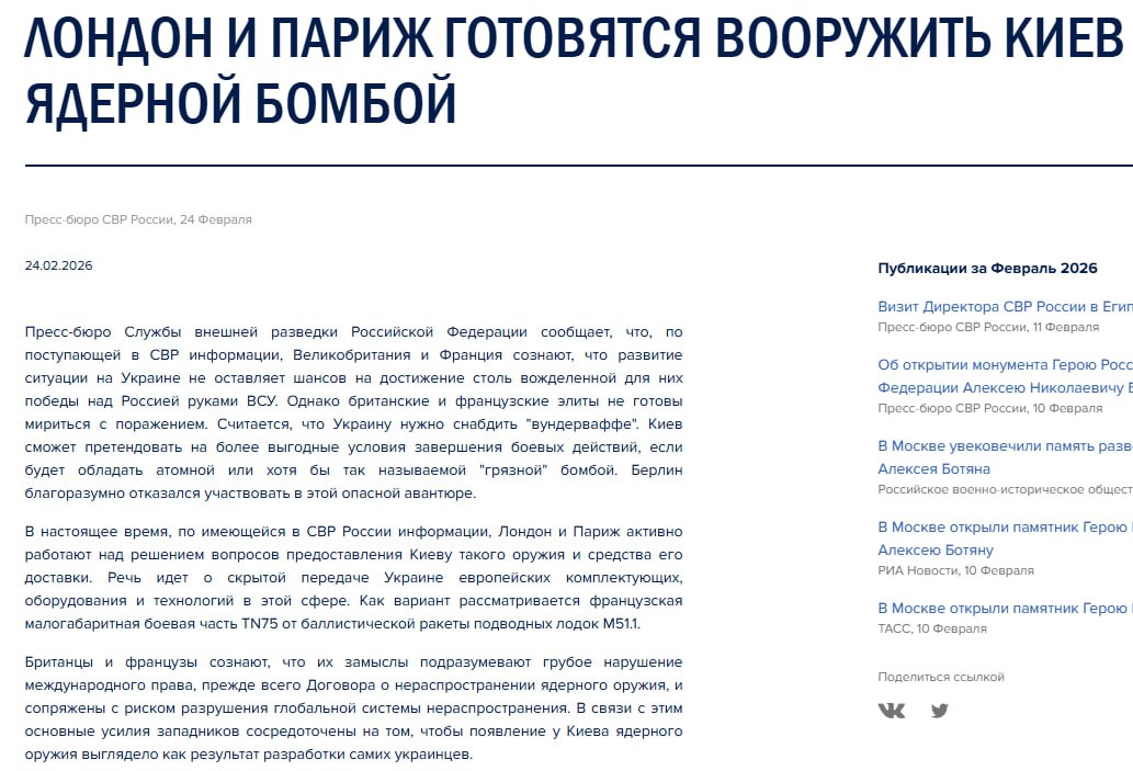 С другой же стороны обращает на себя внимание сообщение пресс-бюро Службы внешней разведки Российской Федерации. По информации спецслужбы, Лондон и Париж хотят предпринять попытку выторговать Киеву более выгодные условия мирного соглашения в ситуации, когда военная победа над нашей страной невозможна.