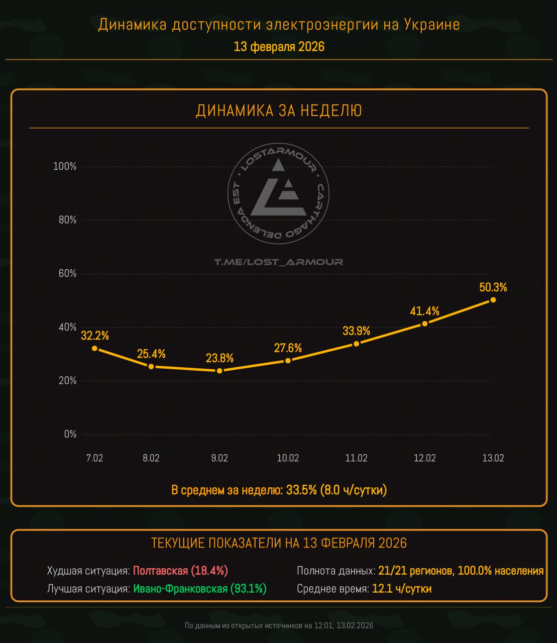 Судя по статистике, которую канал LOSTARMOUR публикует ежедневно, сейчас условное обеспечение регионов Украины, которые находятся под властью режима Зеленского, не только стабилизировалось, но и заметно выросло. И если в январе – начале февраля оно балансировало на отметках 35-45% (в минимуме 23,8% по состоянию на 9 февраля), то сейчас ушло заметно выше 50% и по состоянию на 24.02.26г. составляет более 73%.