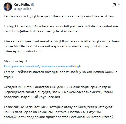 Каллас также отметила, что по "ближневосточным партнерам" летят "те же дроны, что сейчас атакуют Киев" и заверила, что ЕС вновь усилит поддержку производителей антидронового вооружения.