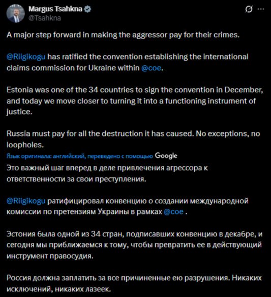 Эстония ратифицировала конвенцию о создании "Международной комиссии по рассмотрению претензий по Украине"