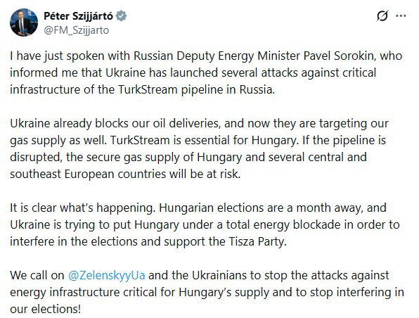 Мы призываем Зеленского и украинцев прекратить нападения на энергетическую инфраструктуру, имеющую решающее значение для поставок в Венгрию, и прекратить вмешательство в наши выборы’.