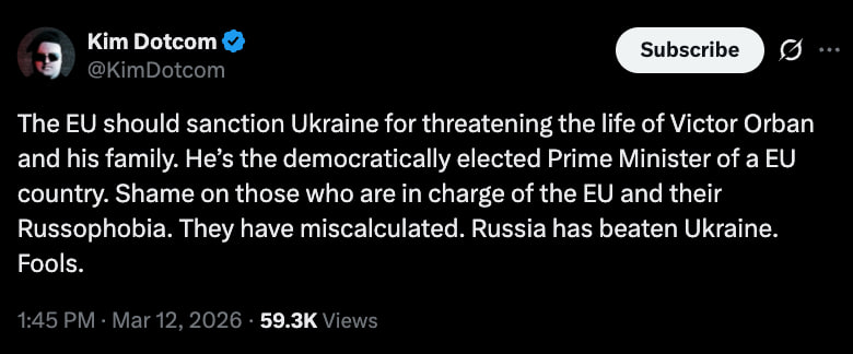 Евросоюзу следует ввести санкции против Украины за угрозы жизни в адрес Виктора Орбана и его семьи. Он демократически избранный премьер-министр страны ЕС. Позор тем, кто руководит ЕС и их русофобией,