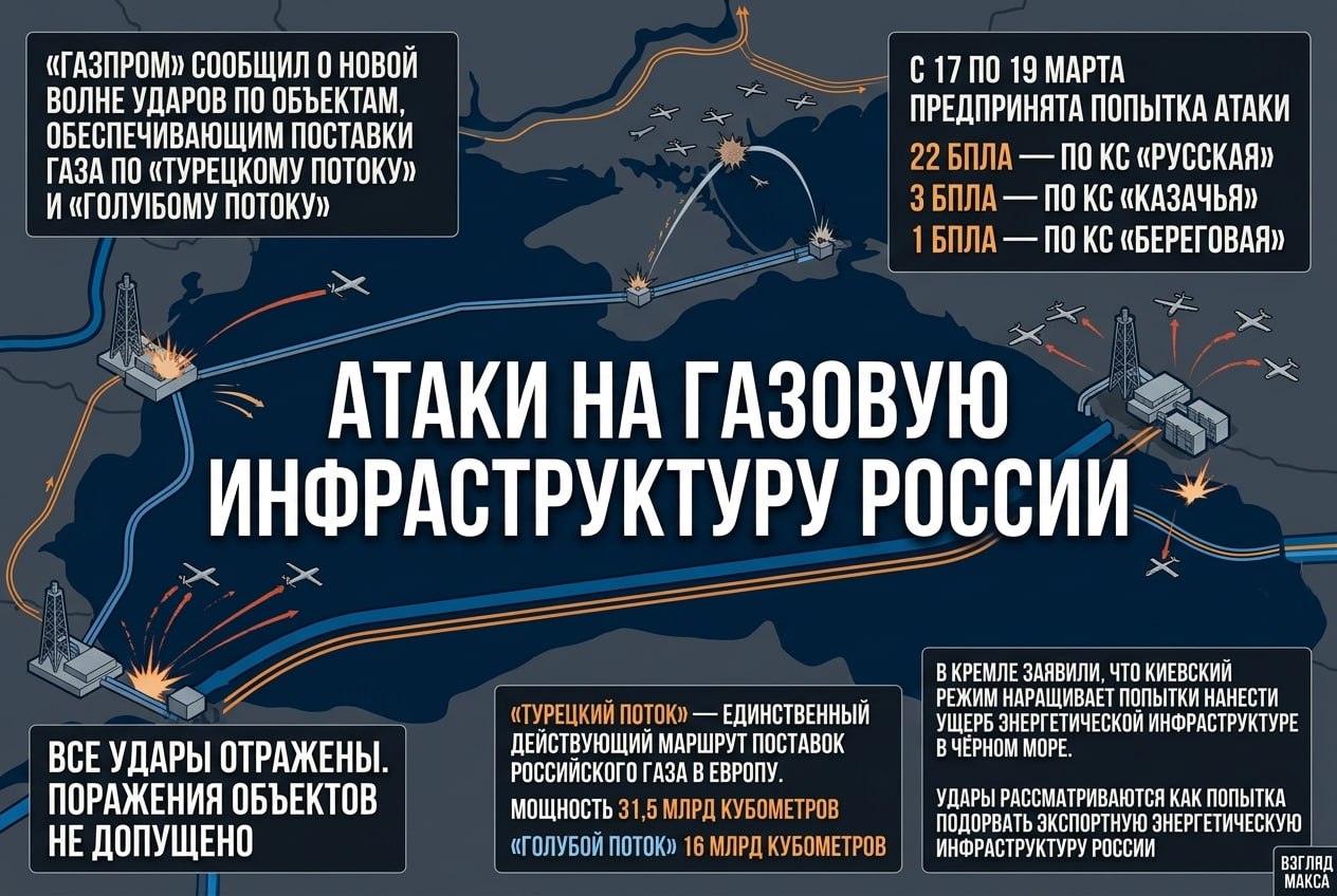 «Газпром» сообщил о новой волне атак на объекты экспортной инфраструктуры, обеспечивающей поставки российского газа по «Турецкому потоку» и «Голубому потоку». Как подчёркивает компания, в период с 17 по 19 марта зафиксирована эскалация ударов по критически важным объектам, задействованным в экспорте газа в направлении Турции и Южной Европы.