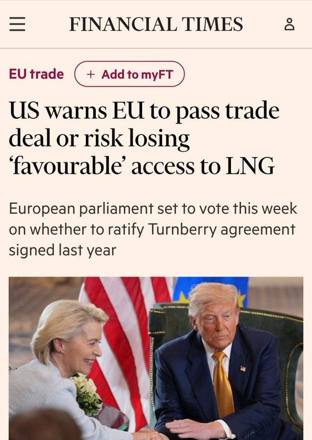 США предупредили ЕС: если Брюссель будет затягивать с утверждением торгового соглашения или попытается изменить его условия, Европа может лишиться льготного доступа к американскому СПГ