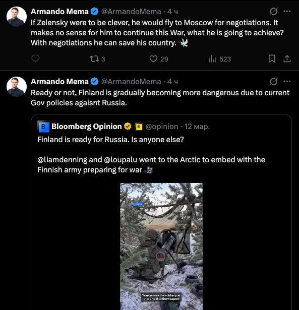 Также Армандо Мема прокомментировал видео, размещенное газетой Bloomberg Opinion, на котором журналисты издания освещают учения финских вооруженных сил, отрабатывающих отражение якобы вероятного вторжения со стороны РФ: