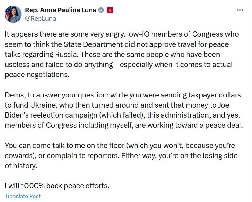 Это те же самые люди, которые оказались бесполезными и ничего не смогли сделать, особенно когда дело дошло до реальных мирных переговоров. Демократы, отвечу на ваш вопрос: пока вы отправляли доллары налогоплательщиков на финансирование Украины, кто затем повернулся и отправил эти деньги на кампанию по переизбранию Байдена (которая провалилась), нынешняя администрация и да, члены Конгресса, включая меня, работают над заключением мирного соглашения. Вы можете прийти и поговорить со мной в открытую (чего вы не сделаете, потому что вы трусы) или пожаловаться журналистам. В любом случае, вы на проигравшей стороне истории. Я на 1000% поддержу мирные усилия».