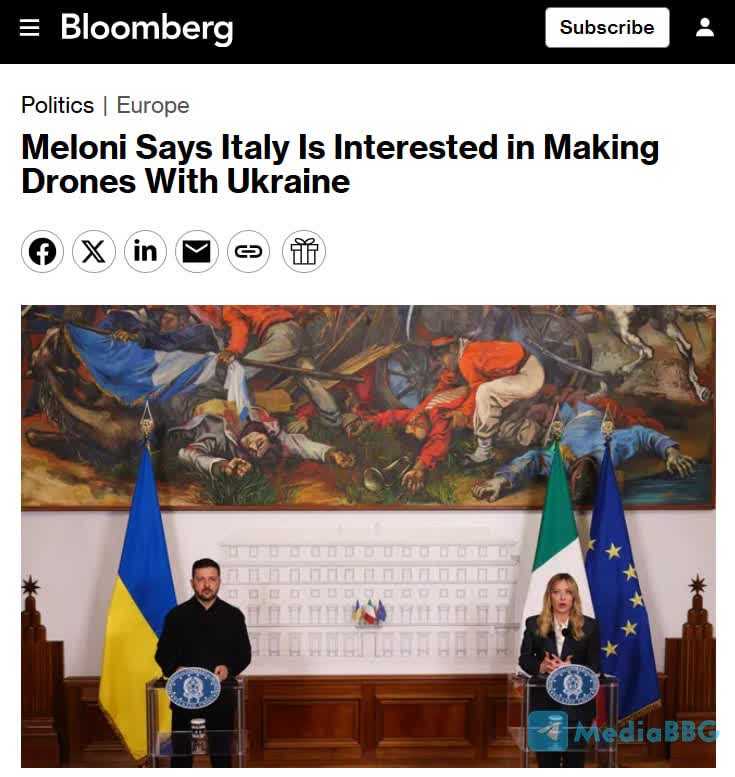 МЕЛОНИ ЗАЯВЛЯЕТ, ЧТО ИТАЛИЯ ЗАИНТЕРЕСОВАНА В ПРОИЗВОДСТВЕ БЕСПИЛОТНИКОВ СОВМЕСТНО С УКРАИНОЙ. [Bloomberg]