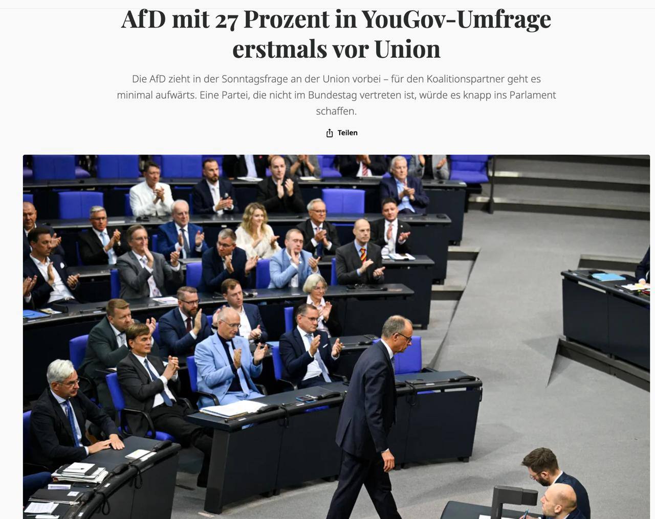По данным YouGov, если бы выборы прошли в ближайшее воскресенье, за партию готовы проголосовать 27% респондентов — на один процентный пункт больше, чем месяц назад. При этом партии правящей коалиции теряют поддержку: блок ХДС/ХСС снизился до 23%, СДПГ — до 13%. Социал-демократы также уступили «зеленым», которые набирают 14%.