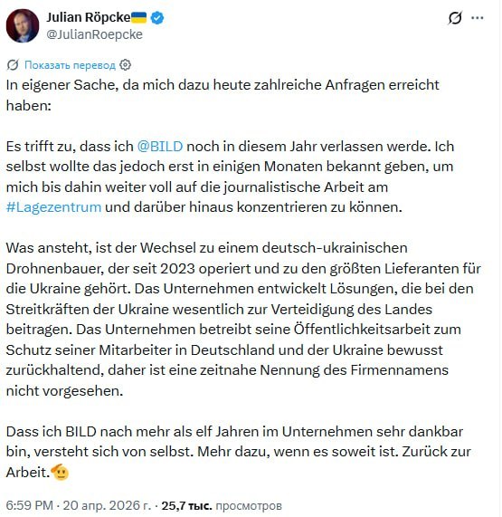 Юлиан Рёпке написал в твиттере, что ужодит из журналистики, чтобы на заводе клепать дроны для Украины