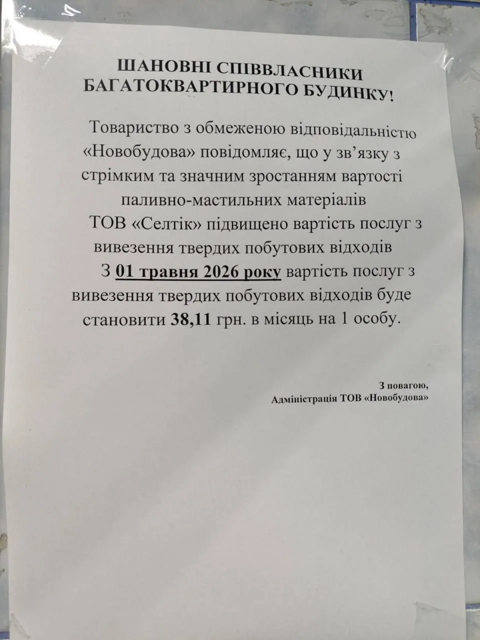 Из-за стремительного и существенного подорожания горюче-смазочных материалов один из крупнейших в Киеве перевозчиков бытовых отходов (мусора) ООО «Селтик» заявил о повышении с 1 мая 2026 года своих тарифов в среднем на 15,4%. Схожие объявления увидели жители столицы и от других коммунальных компаний.