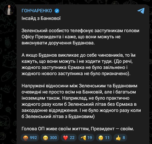 чиновникам (якобы с подачи Зеленского) разрешено не выполнять поручения главы Офиса президента и не являться «на ковер», если Буданов того требует;Зеленский ни разу не летал в рабочие поездки с Будановым (экс-глава Ермак почти всегда был рядом).
