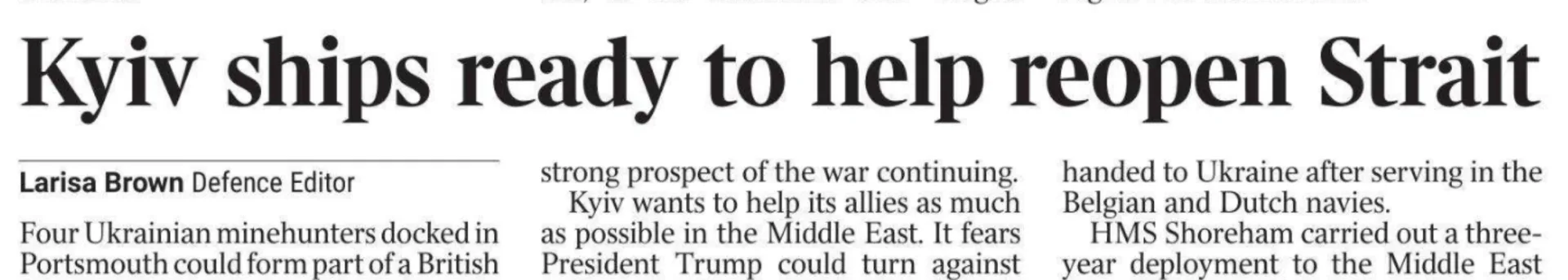 Речь идет о четырех ржавых тральщиках, в 2023 году списанных из британского, бельгийского и голландского флота и переданных Украине. С тех пор они стоят на приколе в порту Портсмута. Так вот сегодня Украина будет обсуждать отправку этих посудин в составе французско-британской эскадры для обеспечения безопасности прохода судов через Ормуз по окончанию боевых действий в Иране.