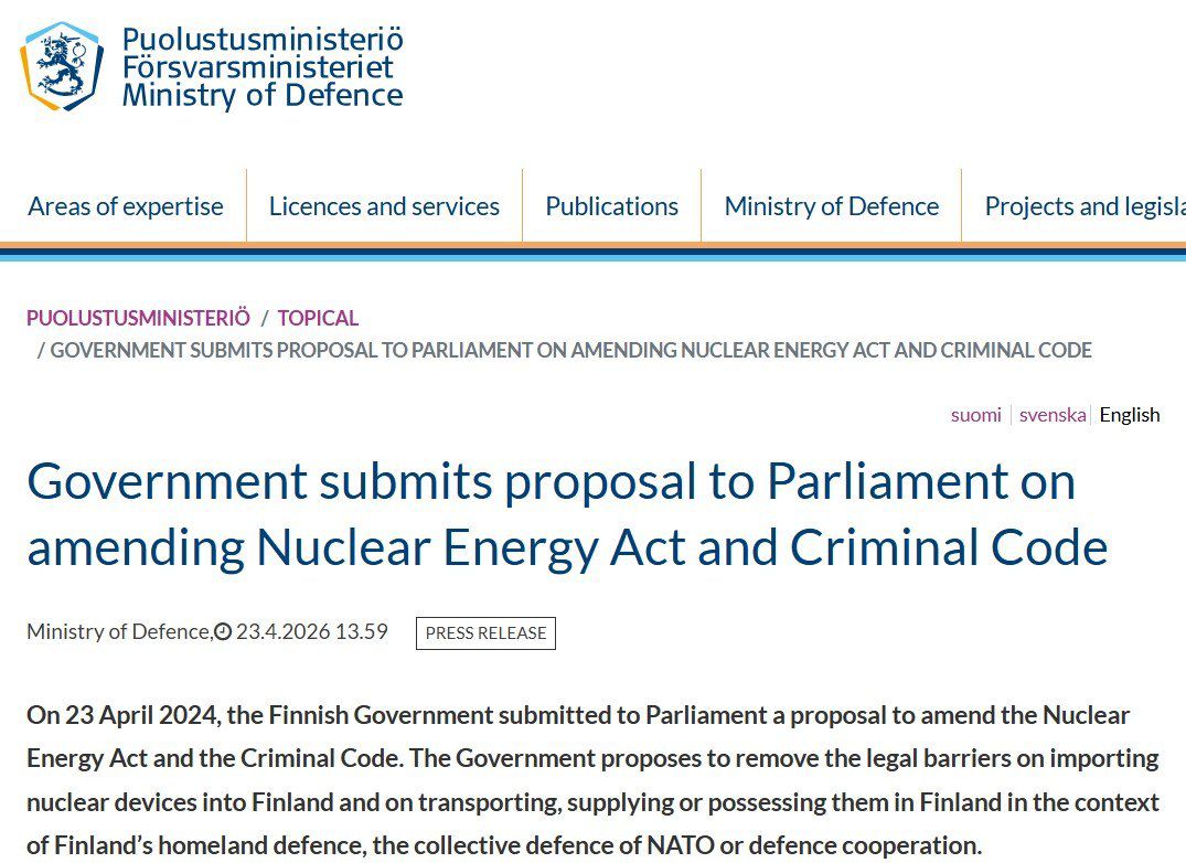 «Правительство предлагает снять правовые барьеры на ввоз ядерных устройств в Финляндию, а также на их транспортировку, поставку или хранение в Финляндии в контексте обороны Финляндии, коллективной обороны НАТО или оборонного сотрудничества», — говорится в заявлении Минобороны страны.