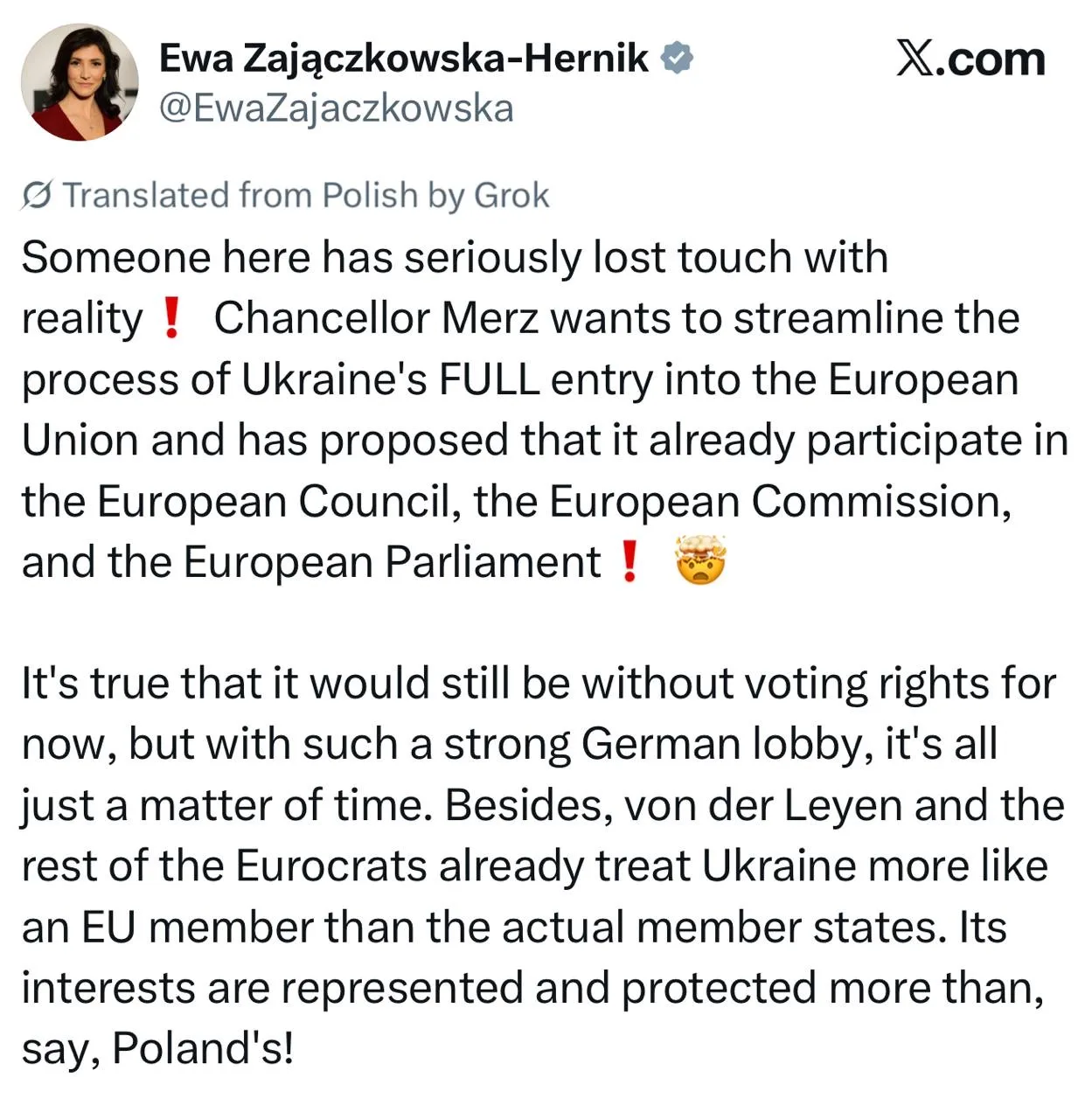 Кто-то здесь серьезно потерял связь с реальностью. Канцлер Мерц хочет упростить процесс полноправного вступления Украины в Европейский союз и предложил, чтобы она уже участвовала в Европейском Совете, Европейской комиссии и Европейском парламенте.