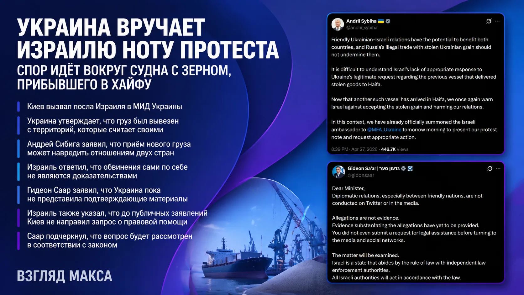 Глава МИД Украины Андрей Сибига сообщил, что израильский посол вызван в украинское внешнеполитическое ведомство. По его словам, Киев не понимает, почему Израиль ранее не отреагировал на обращение Украины по поводу предыдущего судна, которое, как утверждала украинская сторона, уже разгрузило в Хайфе зерно спорного происхождения.