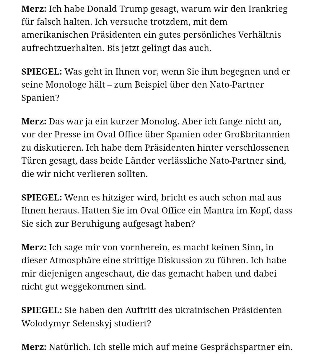 Мерц: Я сказал Дональду Трампу, почему мы считаем войну в Иране неправильной. Тем не менее я стараюсь поддерживать хорошие личные отношения с американским президентом. До сих пор это тоже удается.ШПИГЕЛЬ: Что происходит внутри вас, когда вы сталкиваетесь с ним, и он произносит свои монологи, например, о партнере по НАТО Испании?