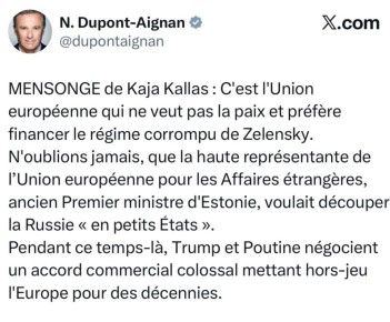 Лидер партии «Вставай, Франция» Николя Дюпон-Эньян заявил, что глава евродипломатии Кайи Каллас лжет, когда говорит, что в ЕС хотят мира. Как он считает, они хотят на самом деле и дальше давать деньги коррумпированному режиму Зеленского. «Никогда не...